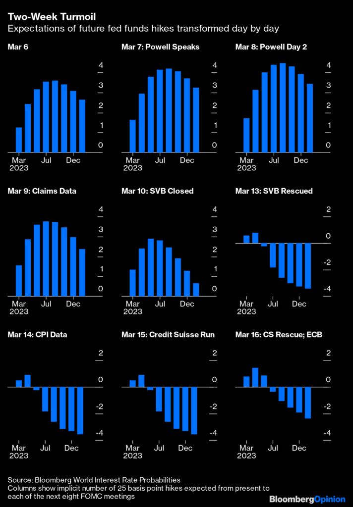 Bloomberg’s John Authers summed up the recent financial turmoil in a series of charts that show how the forecast for future Fed rate hikes changed over a two week period.