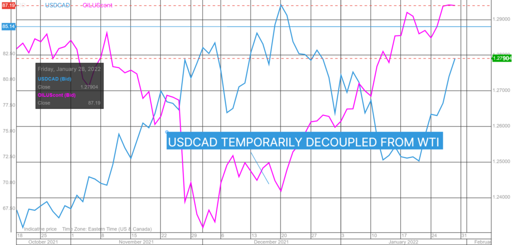 USDCAD price action has decoupled from WTI moves for the past few days after being closely correlated for the past few months. That is unlikely to last. The mix of rising oil prices and BoC rate hikes suggest USDCAD gains are limited.