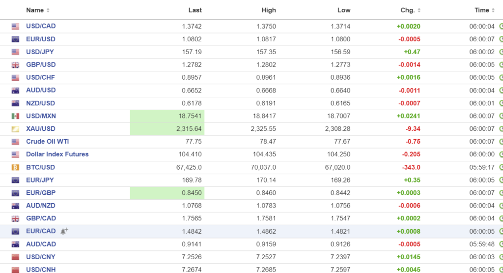 FX high, low, open (as of 6:00 am ET)