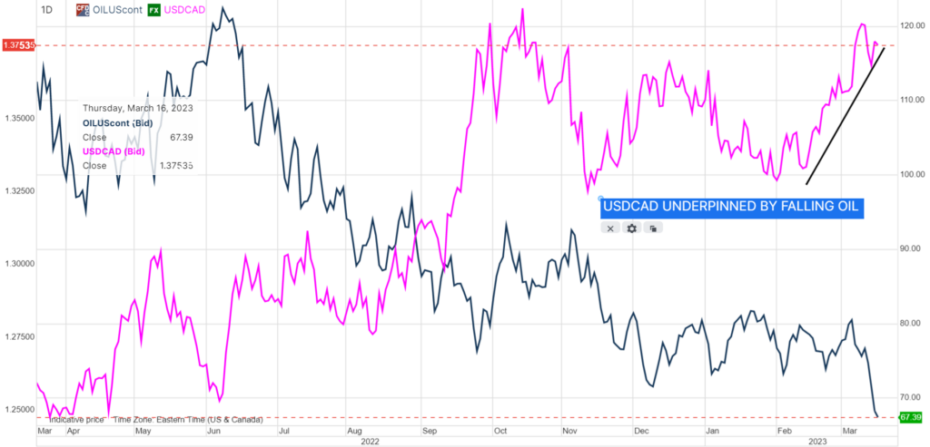 Oil prices are exacerbating USDCAD strength. WTI dropped through $72.70/b, the bottom of the range that had limited losses since January and then accelerated down to $67.15/b today. The drop was exacerbated by rising US crude inventories, broad US dollar strength, and fear of slowing demand if the Banking woes continue.