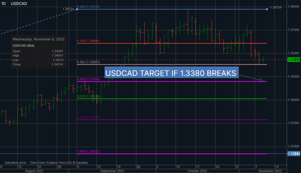 The 1.3380 level is the 38.2% Fibonacci retracement level of the 2022 range which if broken suggests further losses to 1.3190 (50% retracement), then 1.3015 (61.8% retracement).