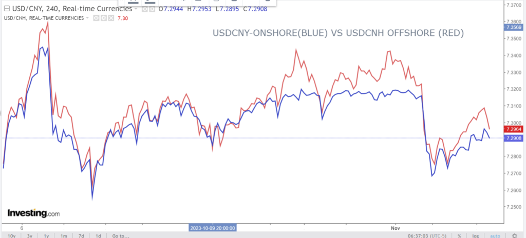Chart: USDCNY (onshore) vs USDCNH (offshore) 3 months