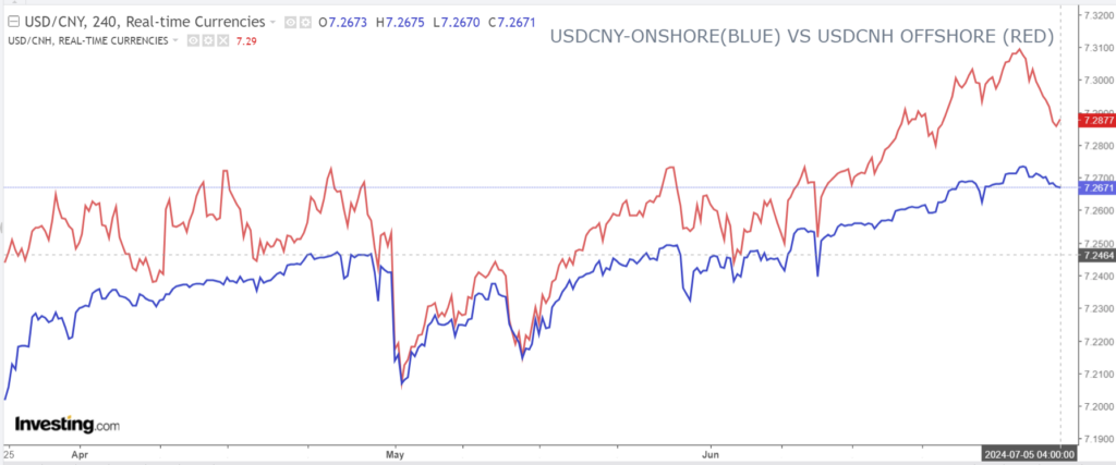 GBPUSD surged to 1.2811 from 1.2754 on the heels of the nonfarm payrolls report. The  UK election saw the Labour Party win a resounding victory  which had zero impact on FX as it was fully priced in. The end of the election leaves the door wide open to a Bank of England rate cut on August 1 and with the odds rising to 71.8% for a similar Fed move on July 31 leaves Gilts and Treasury spreads unchanged.