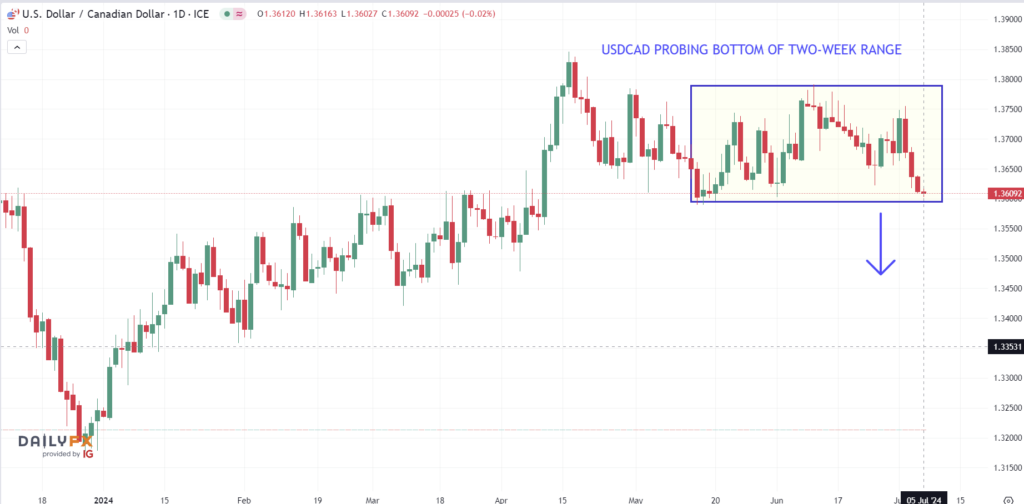 USDCAD lost ground yesterday and then consolidated the losses overnight. UK election news, Biden’s mental health, and the countdown to the US and Canadian employment data limited FX movement. USDCAD rallied from 1.3608 to 1.3632 post-LFS data but has since retreated.