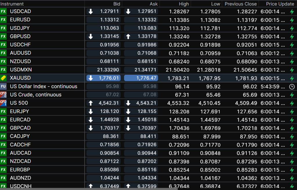 FX open, high, low, previous close as of 6:00 am ET