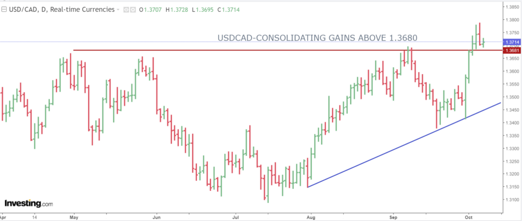 The intraday USDCAD technicals are muddled after USDCAD dropped through support at 1.3730 on an hourly chart and snapped the uptrend from September 29. That suggests an intraday bearish bias while below 1.3740.