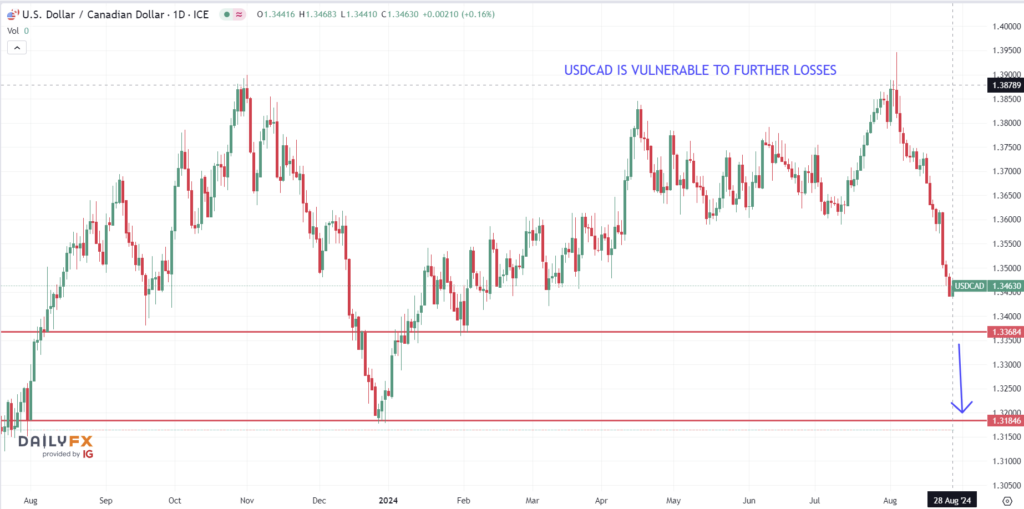 The daily chart shows USDCAD falling sharply towards 1.3380 support which has contained the bottom since February 2024. A decisive breach of this levels suggests a straight shot to 1.3180, the August 2021 low.