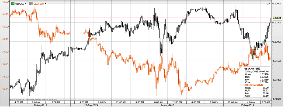 Chart: USDCAD and WTI 10 minute chart showing tick for tick price movement