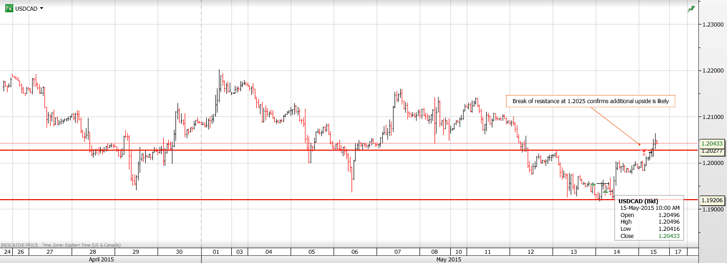 Chart: USDCAD 1 hour with break of resistance noted