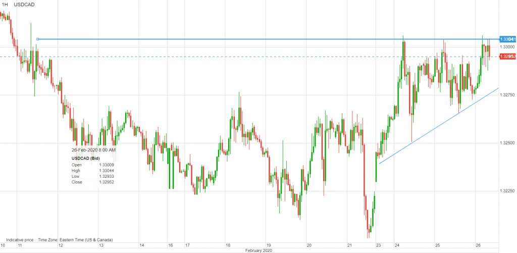 USDCAD continues to drift in this week’s 1.3250-1.3306 range. Prices continue to be supported by falling oil prices, as well as safe-haven demand for US, and (to a lesser degree), Canadian dollars. Coronavirus fears led to the traders forecasting two Fed rate cuts in 2020, according to the FedWatch tool. That change in sentiment has acted as a drag on USDCAD gains from speculation the Bank of Canada (BoC) will cut interest rates in the coming months, with some believing as early as next week.