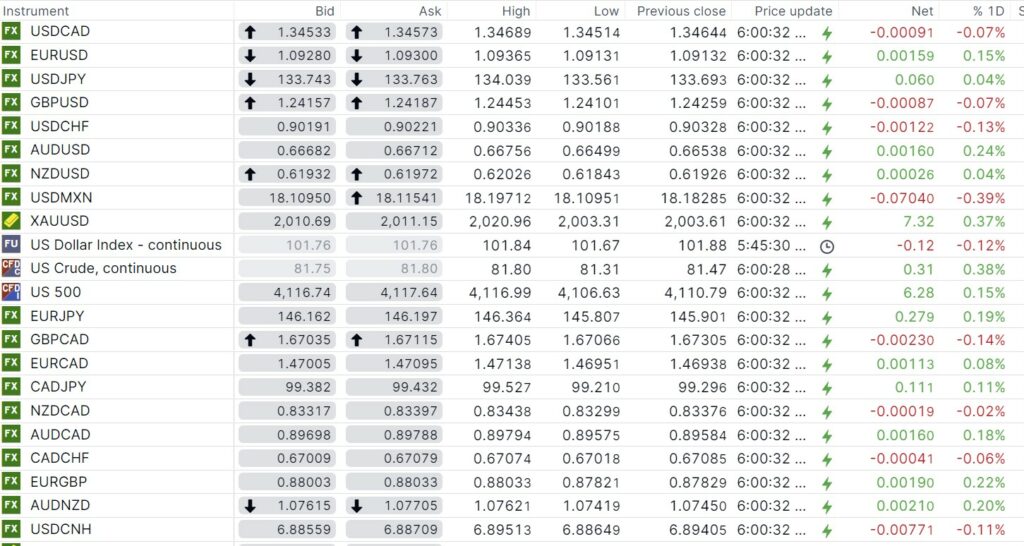 FX open, high, low, previous close as of 6:00 am ET