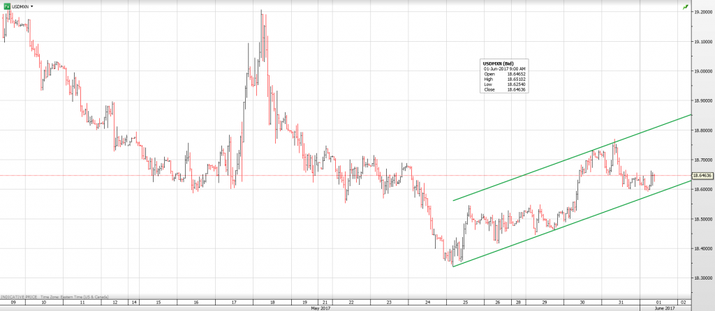 The USDMXN rally that started last Monday is still intact despite yesterday’s decline from 18.7645 to 18.5950 today. That decline occurred after the Bank of Mexico (Banxico) raised its 2017 growth expectations. Banxico now expects GDP to expand 1.5% to 2.5%, up from 1.3% to 2.3%. They did acknowledge risk to the forecast stemming from US protectionist trade policies.