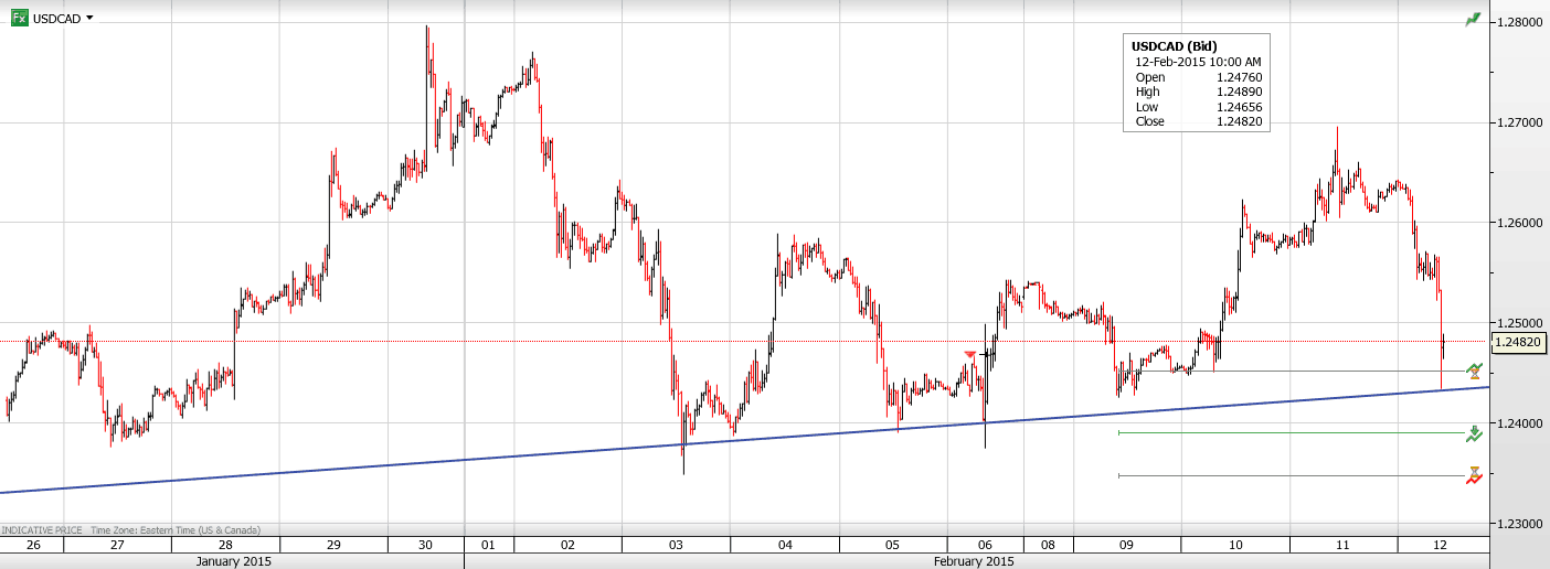 The intraday USDCAD technicals are bearish following this morning’s break of support at 1.2540.  The plunged halted at the next major support level of 1.2440, representing a series of bottoms following the January 15 BoC rate cut. Additional support is seen at 1.2420 representing the uptrend from the end of December, which if broken will extend losses to 1.2115.  For today, USD support in the 1.2420-40 area should hold.