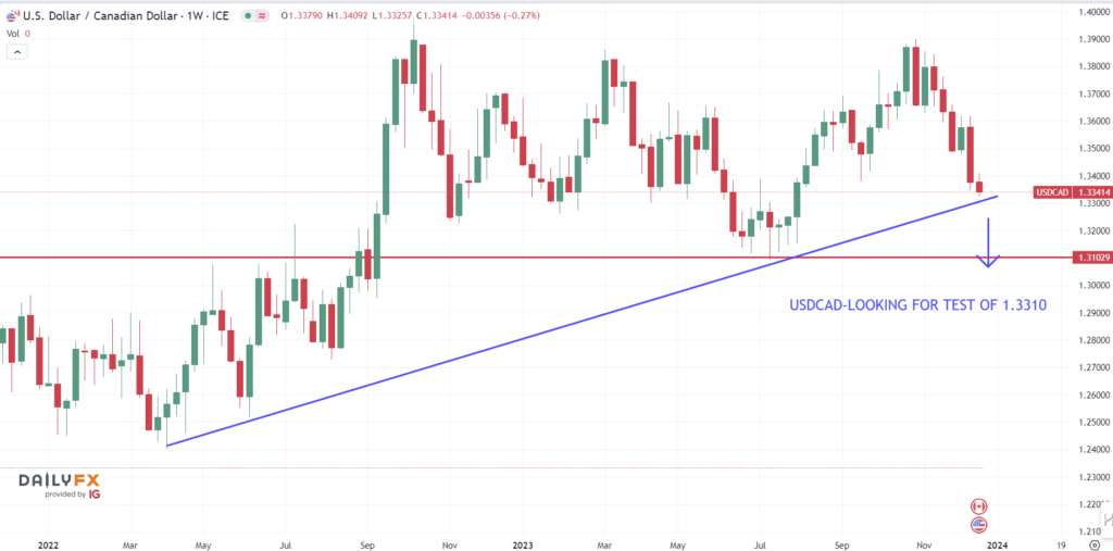 Longer term, USDCAD the April 2022 uptrend line comes into play in the 1.3300-10 area. If it fails to stem the downward momentum, USDCAD will drop to 1.3100. The 50% Fibonacci retracement level of the May 2022, 1.2415-October 2022 1.3960 range is 1.3190.