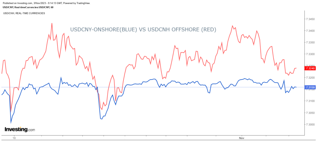Chart: USDCNY (onshore) vs USDCNH (offshore) hourly