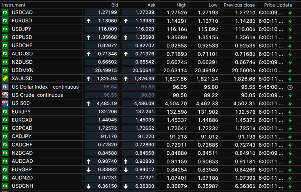 FX open, high, low, previous close as of 6:00 am ET