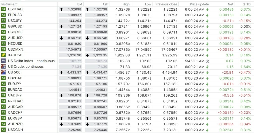 FX open, high, low, previous close as of 6:00 am ET