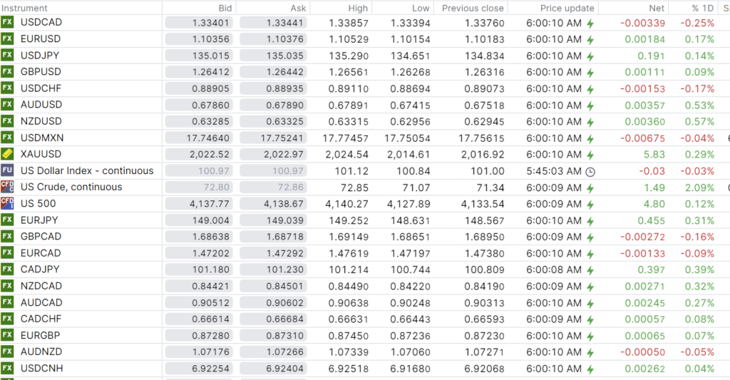 FX open, high, low, previous close as of 6:00 am ET
