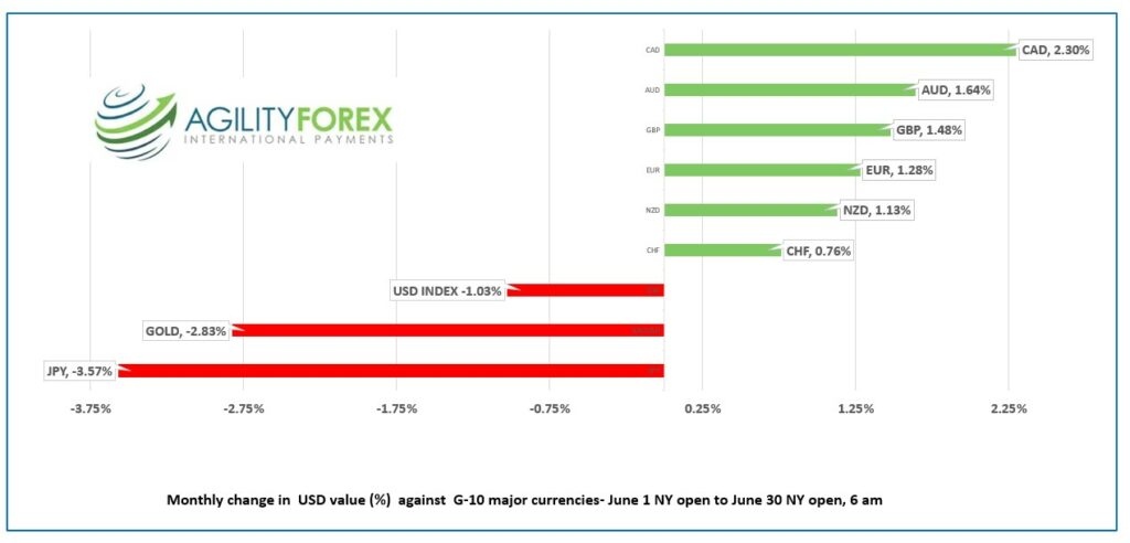 Asia equity indexes were little changed at the close, but the Nikkei 225 finished the month with a 7.45% gain, while Australia’s ASX 200 rose 1.58% for June. European bourses are robust, led by a 1.19% rise in the German DAX, which is on pace to close with a 3.0% gain in June. S&P 500 futures are up 0.45%, and the S&P 500 index is on pace to close June with a 5.20% gain.