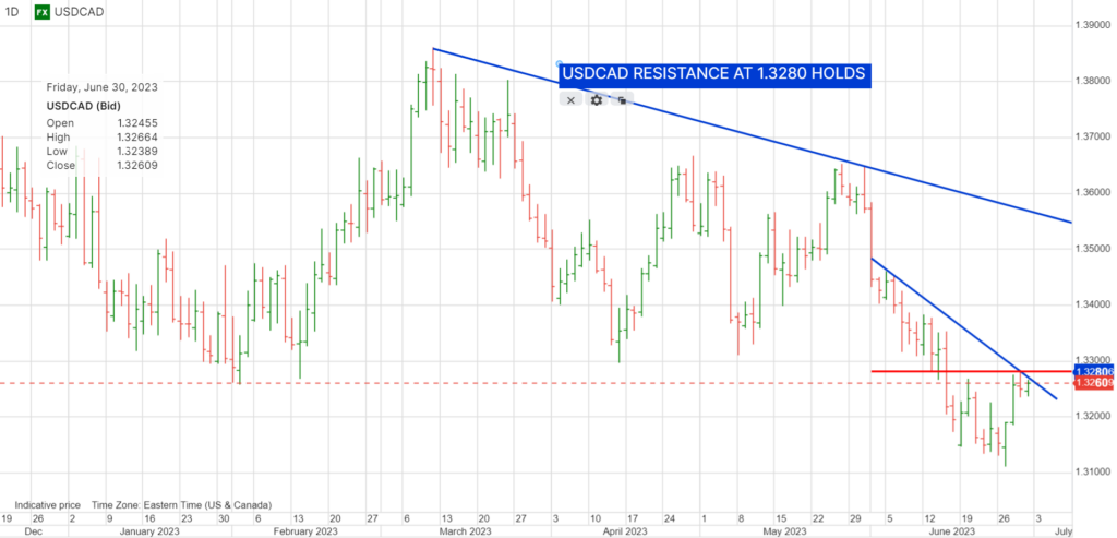 USDCAD lost 2.3% from the NY open on June 1 to today, mainly due to the Bank of Canada’s surprise 25 bp rate hike on June 7, which lifted the overnight rate to 4.75%. That hike squeezed the CAD/US 10-year interest rate differential to its narrowest level for the month (-28.6 bp), while the 2-year CAD/US interest rate differential turned positive (6.7 bp). The spreads have widened out to -50.5 bp and -21.7 bp, respectively.
