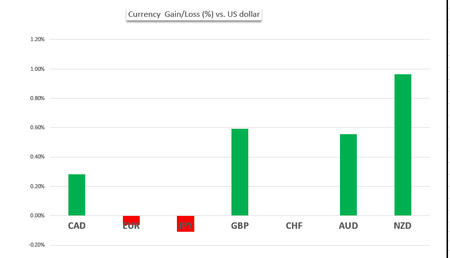 NOTE: This chart represents gain (or loss) of G10 currencies vs. the US dollar from NY close (4pm) to 5:30 am PDT