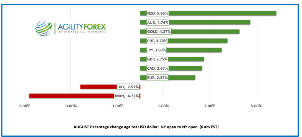 August wasn’t kind to US dollar bulls. The shift in the US interest rate outlook from slow and measured to deeper and faster propelled major G-10 currencies to impressive gains last month. Leading the charge, the New Zealand dollar rallied 5.89%, followed by a 4.74% rise in the Australian dollar. The Canadian dollar and Euro managed gains of 2.67% and 2.37%, respectively. The Mexican peso, however, bucked the trend, losing 4.77% due to a mix of rate cuts, carry trade unwinding, and domestic political concerns.
