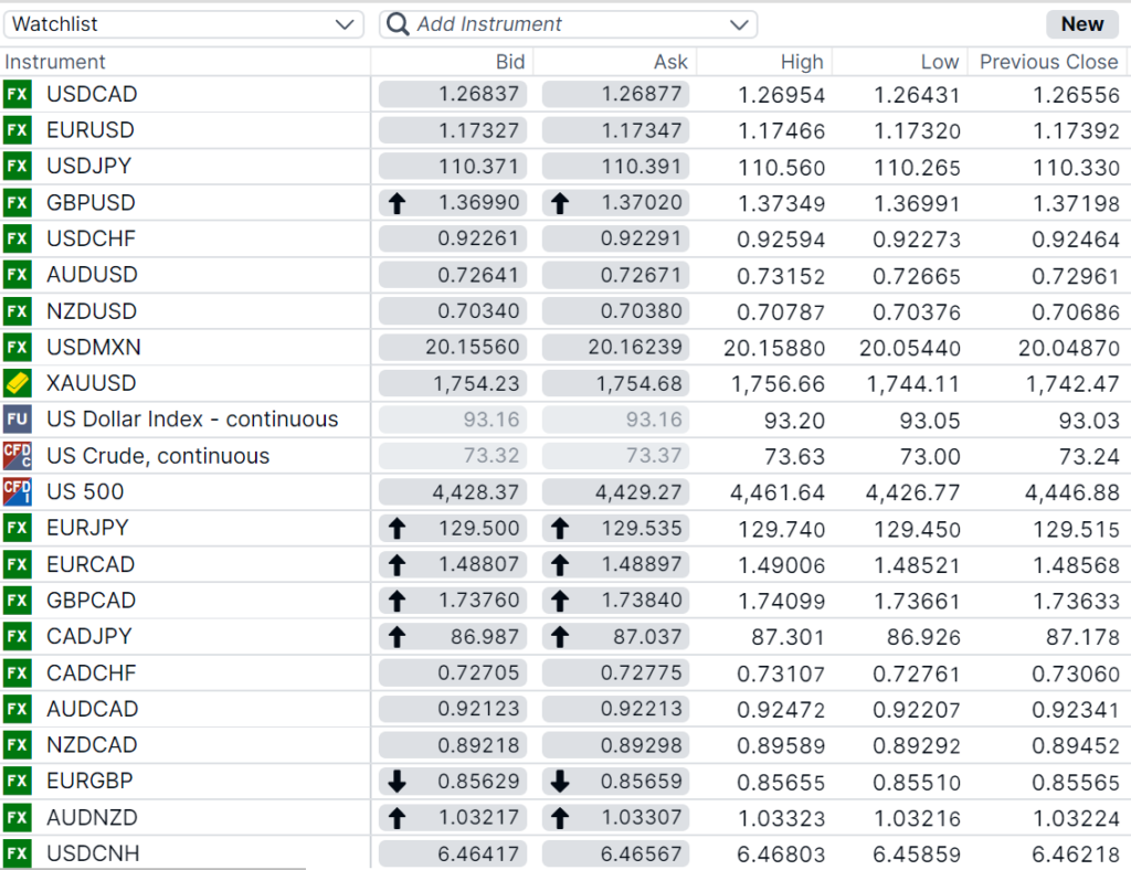 FX open, high, low, previous close