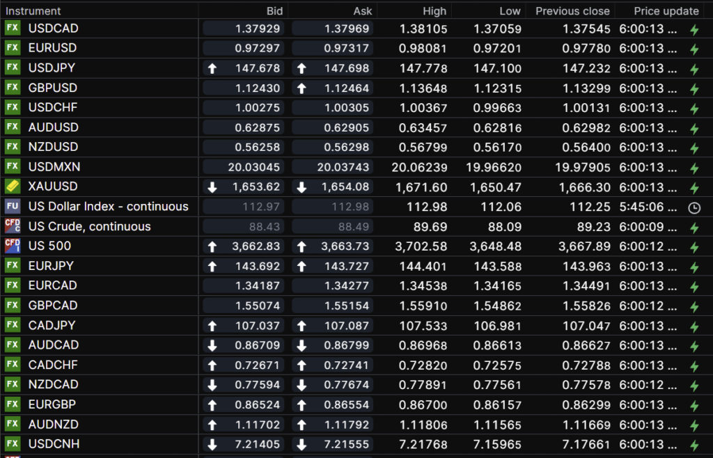 FX open, high, low, previous close as of 6:00 am ET