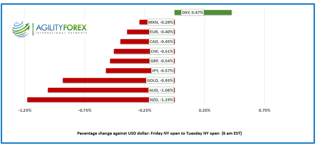 NZDUSD dropped from 0.6265 on Monday to 0.6183 just ahead of the New York open, weighed down by weak Chinese manufacturing data and general US dollar strength.