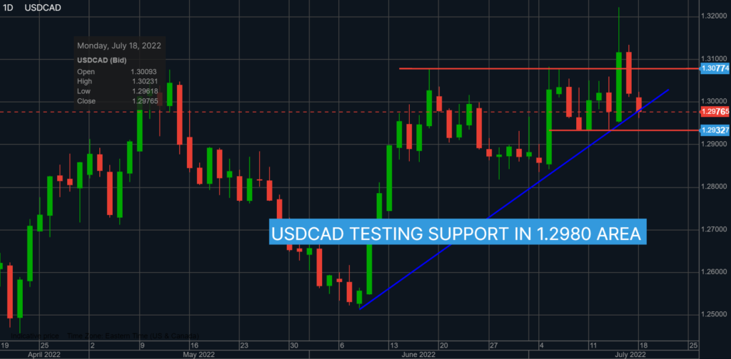 USDCAD traded defensively overnight as it extended Friday’s losses which were fueled by Fed policymakers pushing back against 1.0% rate hike speculation. Stronger than expected US June Retail Sales supported the case for and economic soft landing in America.