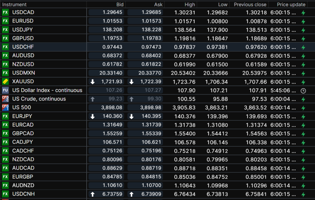 FX open, high, low, previous close as of 6:00 am ET