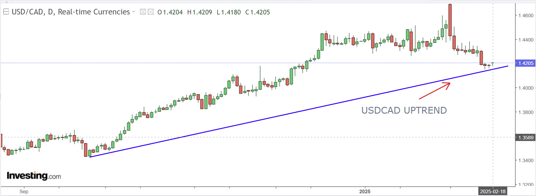 Longer term, the USDCAD uptrend line from September 2024 remains intact while prices are above 1.4140,