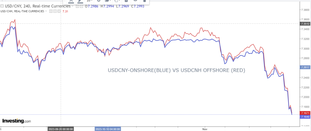 Chart: USDCNY (onshore) vs USDCNH (offshore) 3 months