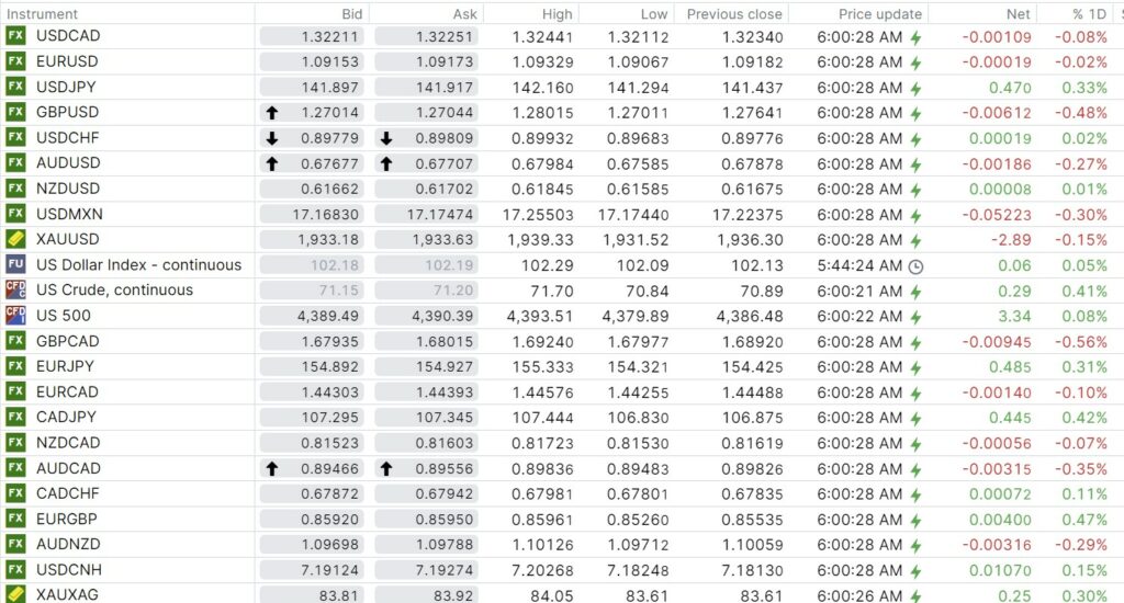 FX open, high, low, previous close as of 6:00 am ET