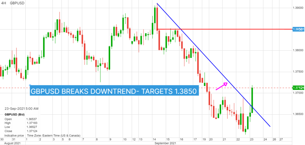 GBPUSD rallied from 1.3614 to 1.3683, then extend gains to 1.3718 after the BoE left interest rates and QE unchanged as expected. Two policymakers voted to reduce QE purchases. Traders noted that surging energy prices could drive inflation over 4.0%, which sparked talk about an earlier than expected interest rate increase. Traders ignored weaker than expected UK PMI data ahead. GBPUSD snapped the downtrend from September 14 and are targeting further gains to 1.3850.