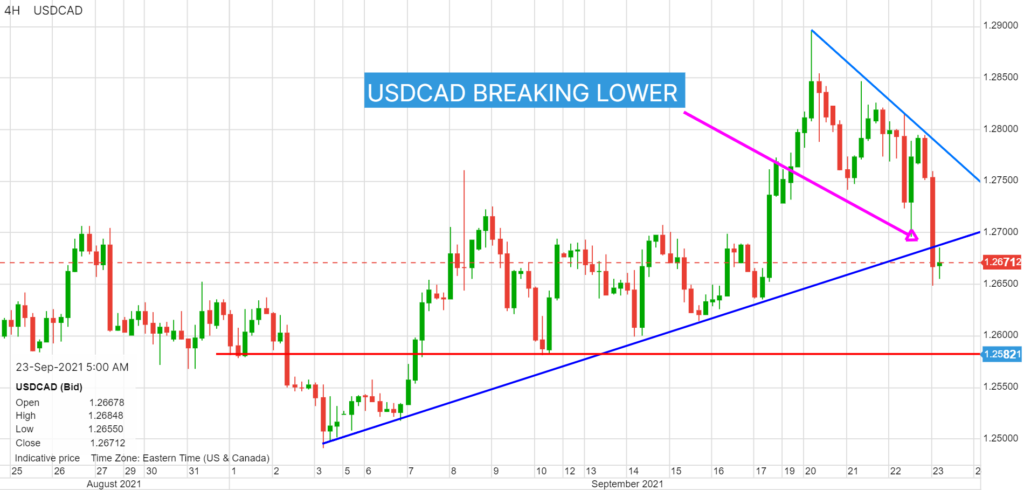 USDCAD was trading around 1.2725 prior to the FOMC meeting, the bounced between 1.2699 and 1.2787 immediately afterwards. The dip occurred because the FOMC did not announce a tapering program at this meeting. The rally happened when it was implied tapering begins in November. Prices traded firmer and peaked in Asia at 1.2794. News the Chinese government continued to pump liquidity into the market and that the Chinese government may restructure Evergrande, turned risk sentiment positive. The US dollar retreated against the majors and USDCAD went along for the ride.