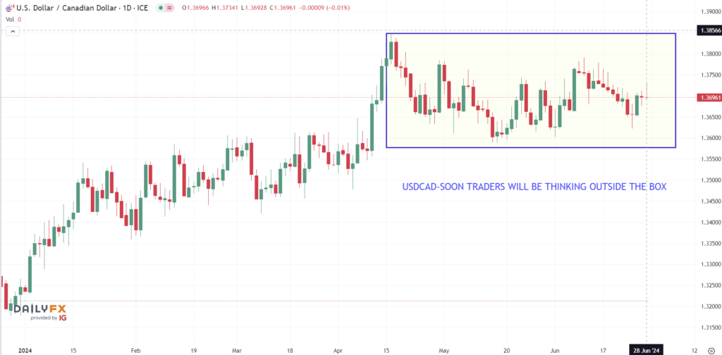 USDCAD has been boxed inside a 1.3550-1.3850 since April 10 and is in the middle of that range currently.