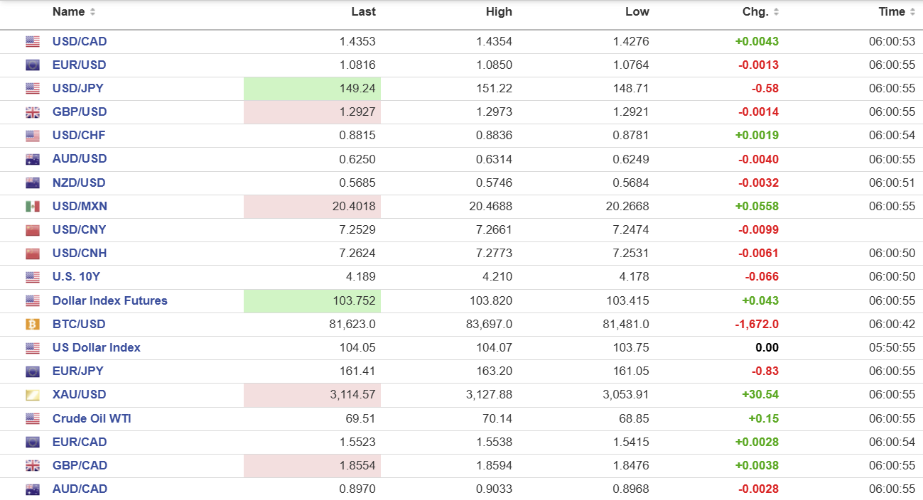Wall Street had a bad day on Friday, and it was worse for Asian equity markets overnight. Trump’s comments and threat of escalating tariffs drove Australia’s ASX 200 down 1.74%, and Japan’s Topix fell 3.57%. European bourses are drowning in a sea of red ink, led by a 1.82% drop in the German Dax and a 1.17% plunge in the FTSE 100. S&P 500 futures are down 0.88% and safe-haven gold (XAUUSD) rose to 3127.88 from 3054.75 at Friday’s low. The 10-year Treasury yield dropped to 4.178% from 4.36% on Friday. The US dollar index is above the middle of its 103.42–103.83 range as risk aversion sinks the greenback against the yen, Swiss franc, and euro.