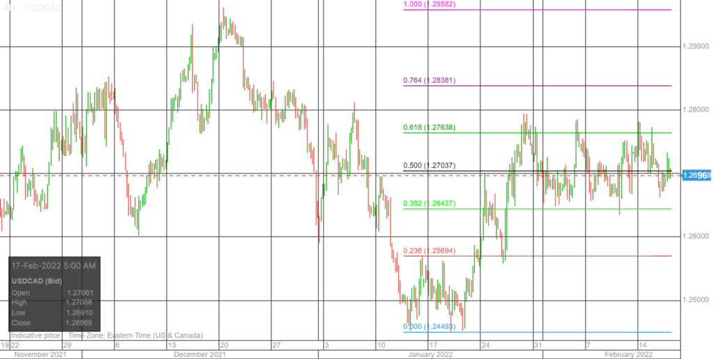 Technical view:  The intraday are unchanged from yesterday. USDCAD is rangebound in a 1.2650-1.2770 band. A topside break would extend gains to 1.2840 while a downside drop targets 1.2574. The uptrend line from June 2021 is intact above 1.2500.