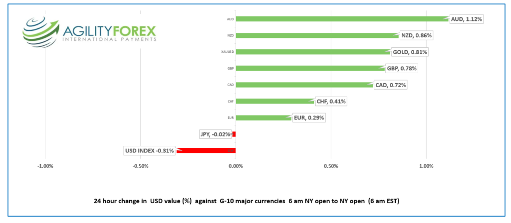 The US dollar is under pressure in thin holiday trading. Market risk sentiment is positive following reports that Omicron is less severe than the Delta variant and upbeat US economic reports yesterday.