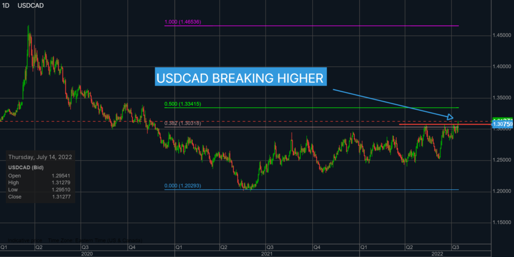 USDCAD jumped from 1.2975 to 1.3060, prior to the BoC announcement after US inflation surged to a higher than expected 9.1% compared to 8.6% in May. The BoC announcement knocked USDCAD down to 1.2936 by noon.