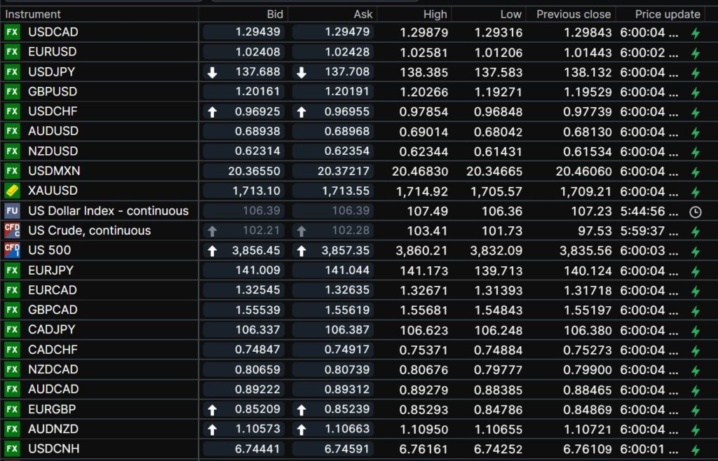 FX open, high, low, previous close as of 6:00 am ET