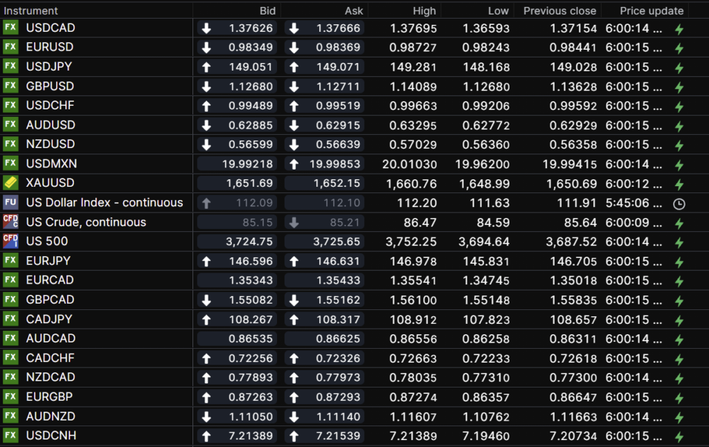 FX open, high, low, previous close as of 6:00 am ET