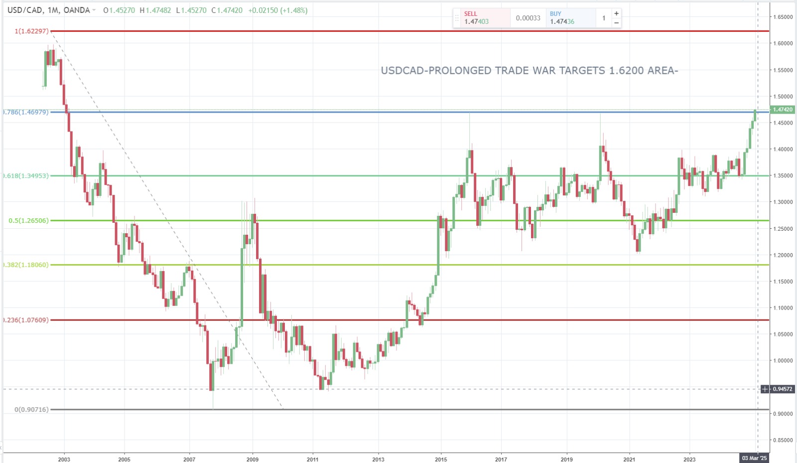 The immediate victim is the Canadian dollar. USDCAD reached 1.6220 in the aftermath of the 911 crisis. (Remember, that was when America considered Canada a friend and ally). That is a reasonable target if it is a prolonged trade war. Fibonacci retracement analysis suggest that a decisive move above 1.4750 targets the 1.5020 area and then 1.5500. However, the initial reaction is occurring in something close to a vacuum as Chinese markets are still closed. Nevertheless, for now the world wants to own US dollars.