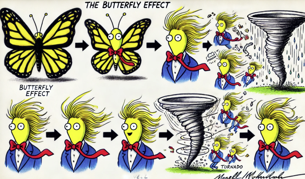 The Butterfly Effect is a concept from chaos theory which suggests that small changes or actions can have large, unpredictable consequences over time. It’s often illustrated by the idea that the flap of a butterfly’s wings in one part of the world could eventually cause a tornado in another part. Donald Trump has the same effect on financial markets.