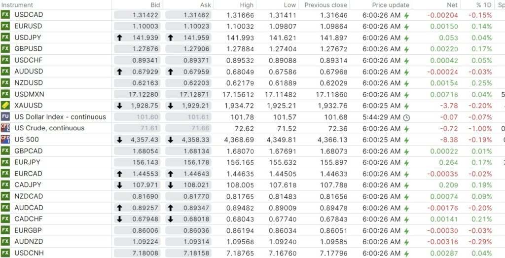 FX open, high, low, previous close as of 6:00 am ET