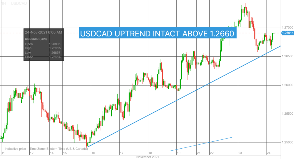 USDCAD peaked at 1.2742 yesterday as trader’s looked past Fed Chair Powell’s re-nomination and booked profits ahead of the US Thanksgiving holiday. Prices dropped 1.2660, closed at 1.2670 and consolidated in a 1.2667-1.2692 range overnight.