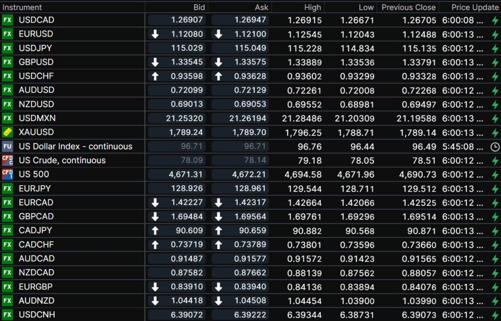 FX open, high, low, previous close as of 6:00 am ET