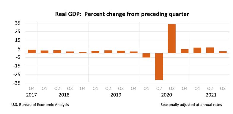 The Bureau of Economic analysis (BEA) wrote: “Real gross domestic product (GDP) increased at an annual rate of 2.1 percent in the third quarter of 2021 according to the “second” estimate released by the Bureau of Economic Analysis. In the second quarter, real GDP increased 6.7 percent. The deceleration in real GDP in the third quarter was led by a slowdown in consumer spending. A resurgence of COVID-19 cases resulted in new restrictions and delays in the reopening of establishments in some parts of the country.”