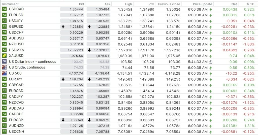 FX open, high, low, previous close as of 6:00 am ET